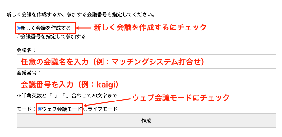 まず、画面上の新しく会議を作成するをチェックしてください。次に、会議名(例:マッチングシステム打合せ)と、参加用の会議番号(例:kaigi)をそれぞれ入力します。この番号は、招待したい相手へプライベートメッセージなどで事前に共有しておきましょう。