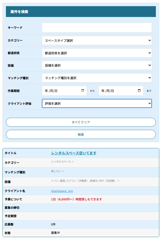 本サービスでマッチングを開始するための入り口には、「案件の登録」と「案件への応募」の2通りがあります。ご利用いただける機能は会員の種別(発注側・受注側など)によってあらかじめ決まっておりますので、ご自身の権限に応じたいずれかの手順に沿って操作を進めてください。