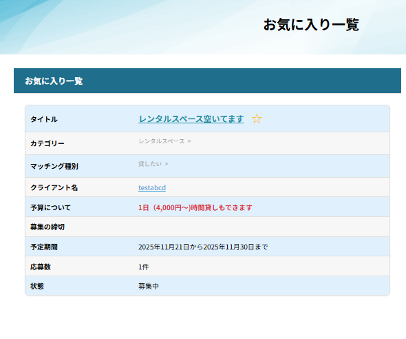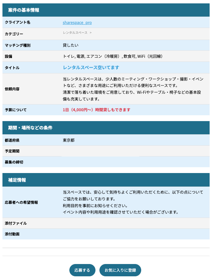 サイドメニューの「案件登録」から、新規入力画面へ進むことができます。検討者の不安を解消し、応募へと繋げるためには、詳細情報を丁寧に記載することが何よりの近道です。