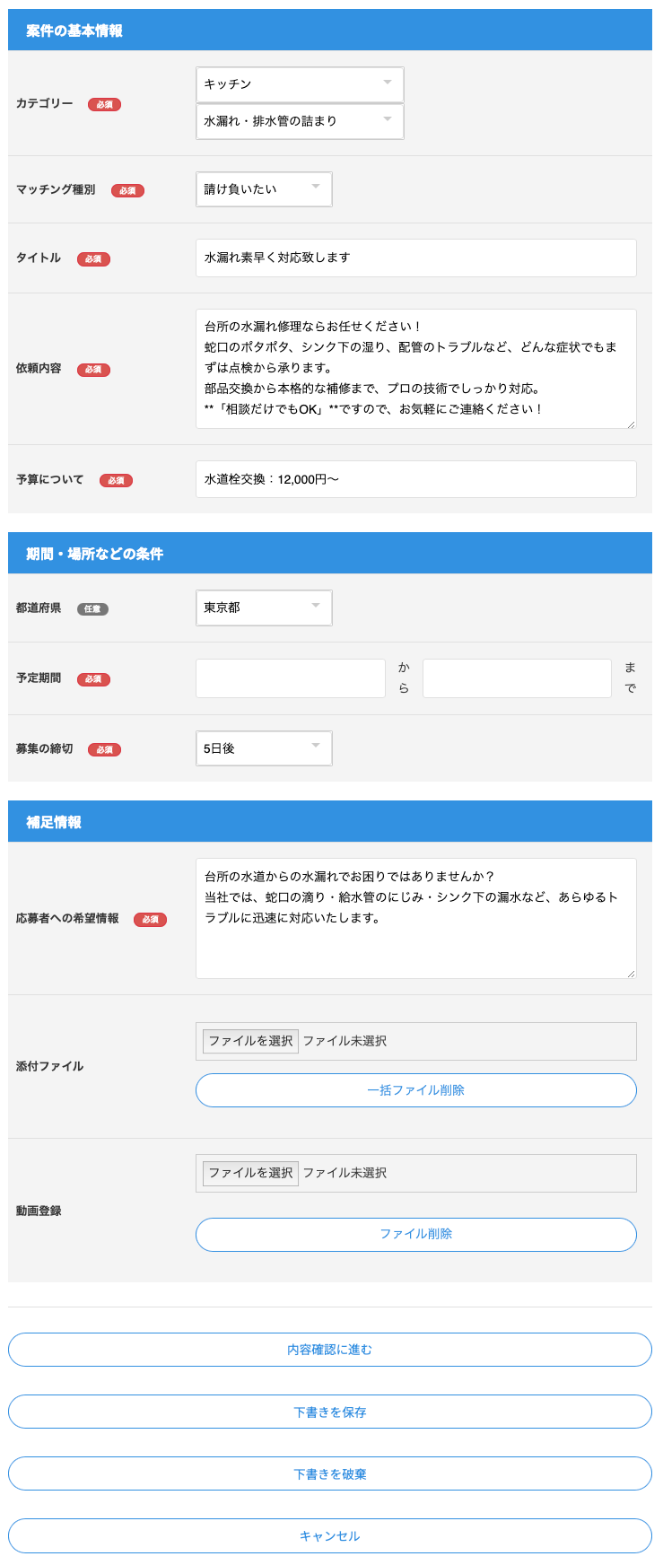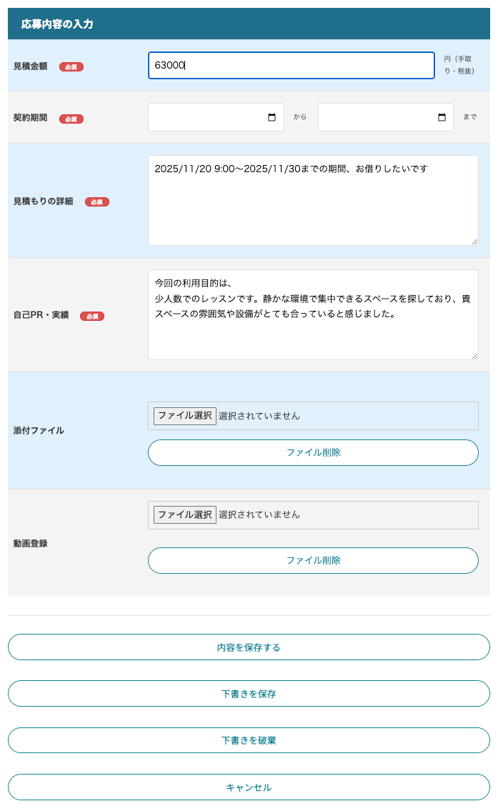 応募内容の入力には時間がかかる場合があるため、「下書きを保存」ボタンを適宜活用してください。このボタンを押しておけば、途中で作業を中断しても、次に案件応募ページを開いた際に前回の入力内容が自動で復元されます。すべての項目を書き終えたら、「内容を保存する」をクリックして確認画面へ進み、最終的な内容をチェックしましょう。