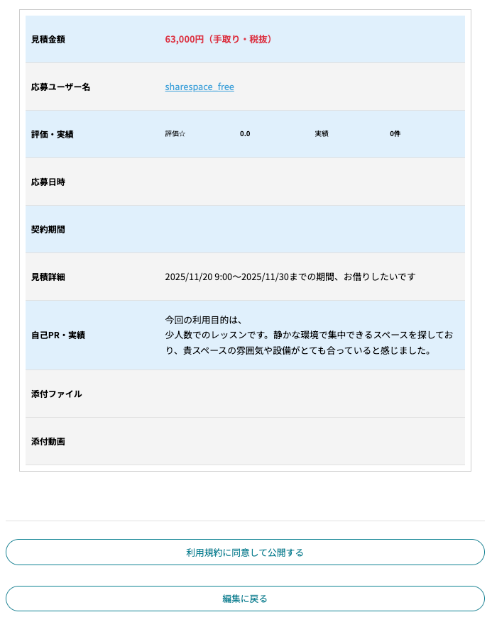 案件表示ページの「応募する」をクリックして、応募専用の入力画面へ進んでください。選定の可能性を最大限に引き出すためには、自身のスキルや提案内容を可能な限り具体的に記載し、依頼主があなたの強みを深く理解できるようにすることが重要です。