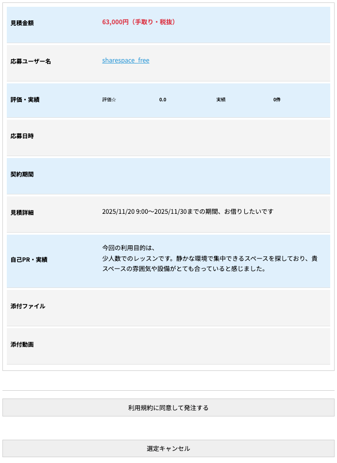 成約後の詳細な打ち合わせをサポートするため、専用のメッセージ機能を用意しています。業務の細部に関する相談や確認をこのツールに集約させることで、お互いの認識のズレをなくし、プロジェクトを計画通りに進行させる助けとなります。
