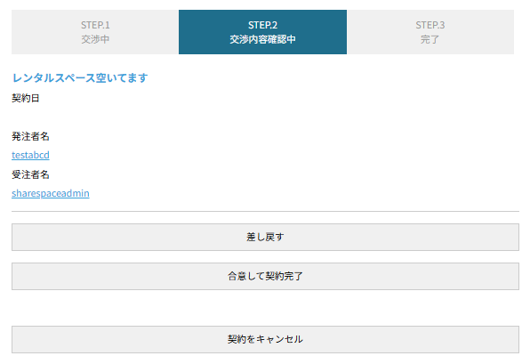 「利用規約に同意して受注する」をクリックすると、詳細を確認するための契約表示画面(契約内容の確認画面)へと切り替わります。この画面にて、案件の登録者と応募者の双方が承認の操作を完了させることで、システム上で正式な契約が成立します。