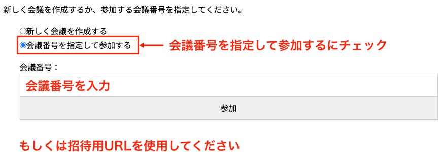 会議へ参加するための方法は2通りあります。画面上の会議番号を指定して参加するを選択して番号を入力するか、もしくは配布された招待用URLから直接アクセスしてください。