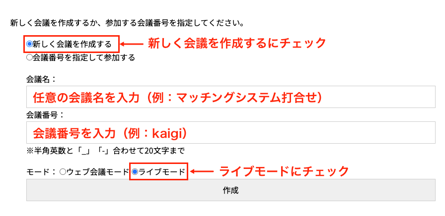 まず、新しく会議を作成するという項目を選択してください。会議名には内容が分かるタイトル(例:マッチングシステム打合せ)を、会議番号には任意の文字列(例:kaigi)を入力します。